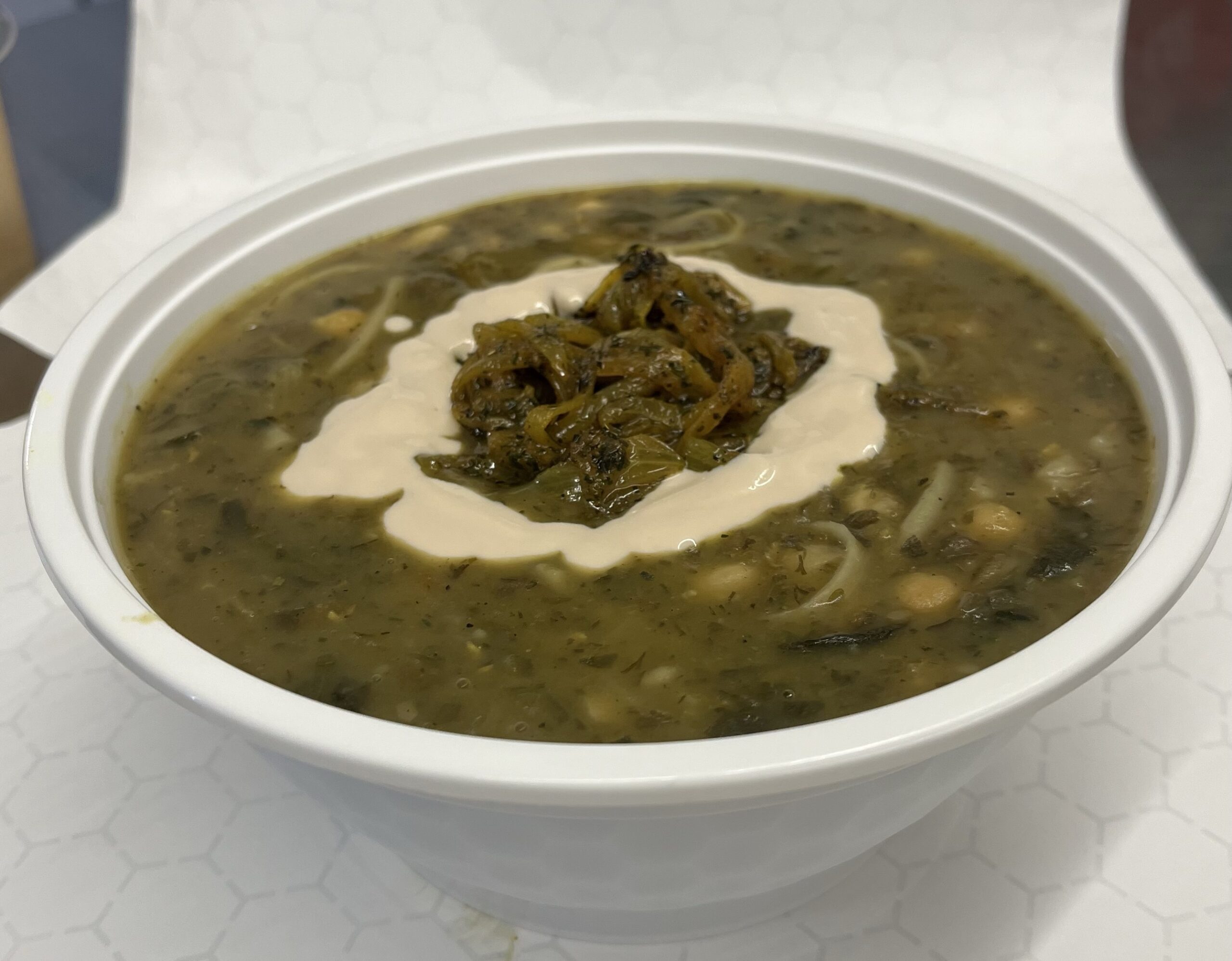 Persian noodle and herb soup made with legumes, greens, and thick noodles, traditionally topped with tangy kashk (fermented whey)